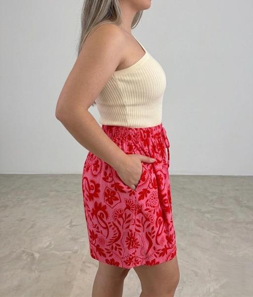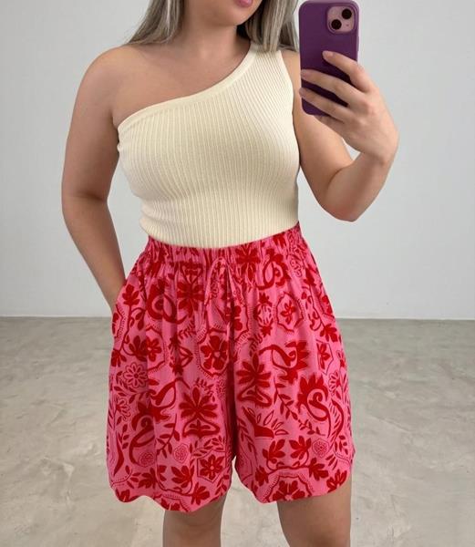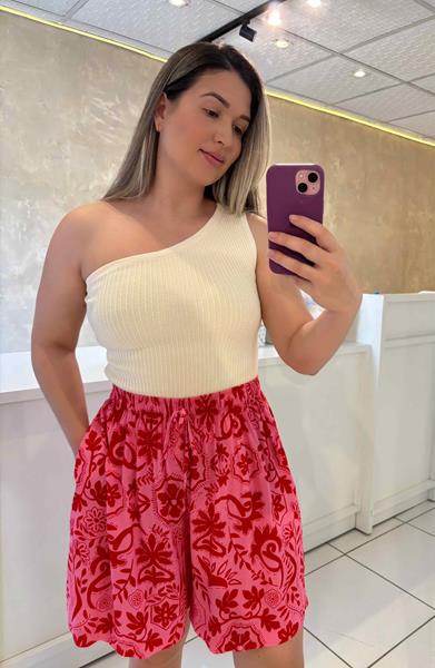 A ESTAMPA QUE VAI ALEGRAR SEU DIA - Este shorts de estampa exclusiva em tons de rosa e vermelho, com uma modelagem perfeita e cintura alta.